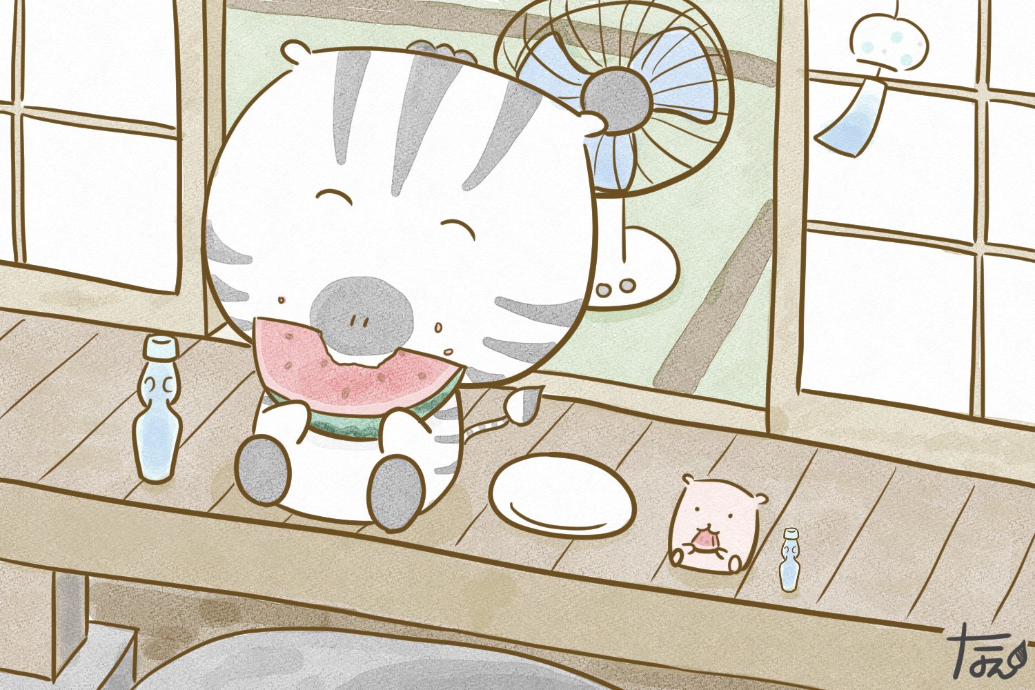 季節のイラストカレンダー 縁側でスイカを食べたら種の飛ばし合いをした 水彩イラスト たかなかアトリエ